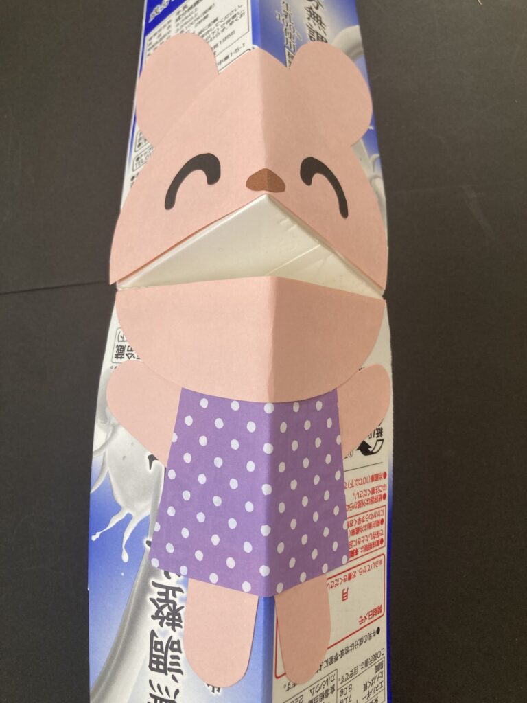 牛乳パックの正面に、顔と体のパーツを貼り付けます。
